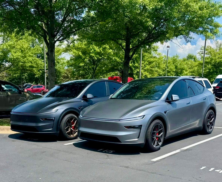 The silver wheels stay looking great in the winter with the salt on them! I went with 235/55R18 Goodyear UltraGrip Performance+ SUV tires. All is well so far, a substantial improvement over the factory all seasons on my Model Y. Difficult to determine any range impacts as it's been so darn cold up where I am — hoping for a few days above freezing so I can benchmark better. I only have one complaint, these wheels should come with lug nut covers included! I ended up 3d printing my own.